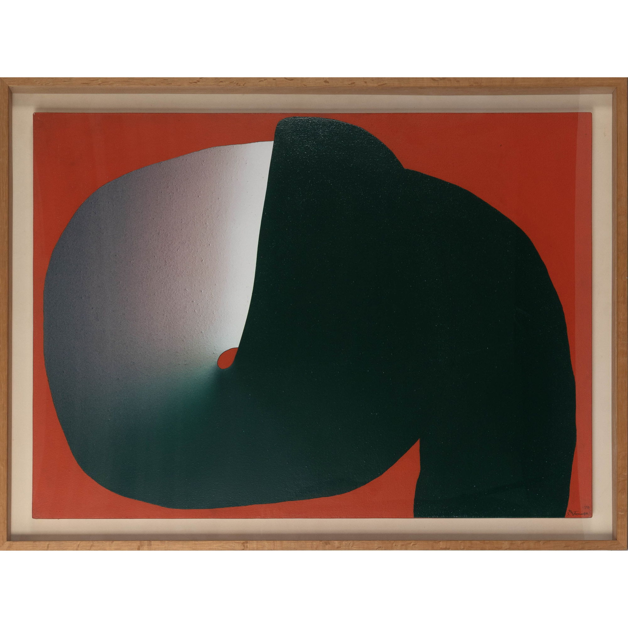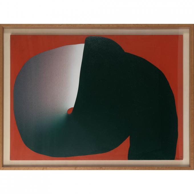その後、元永定正はアクリル絵具によるエアブラシ技法を取り入れ、柔らかな背景の上に高彩度の色彩と明確な輪郭をもつ幾何学的形態を重ねることで、明るく純度の高い色彩と、カートゥーン的ともいえる視覚的特徴を発展させていった。こうした試みは、作家独自の表現言語をさらに豊かなものへと展開させていくこととなった。