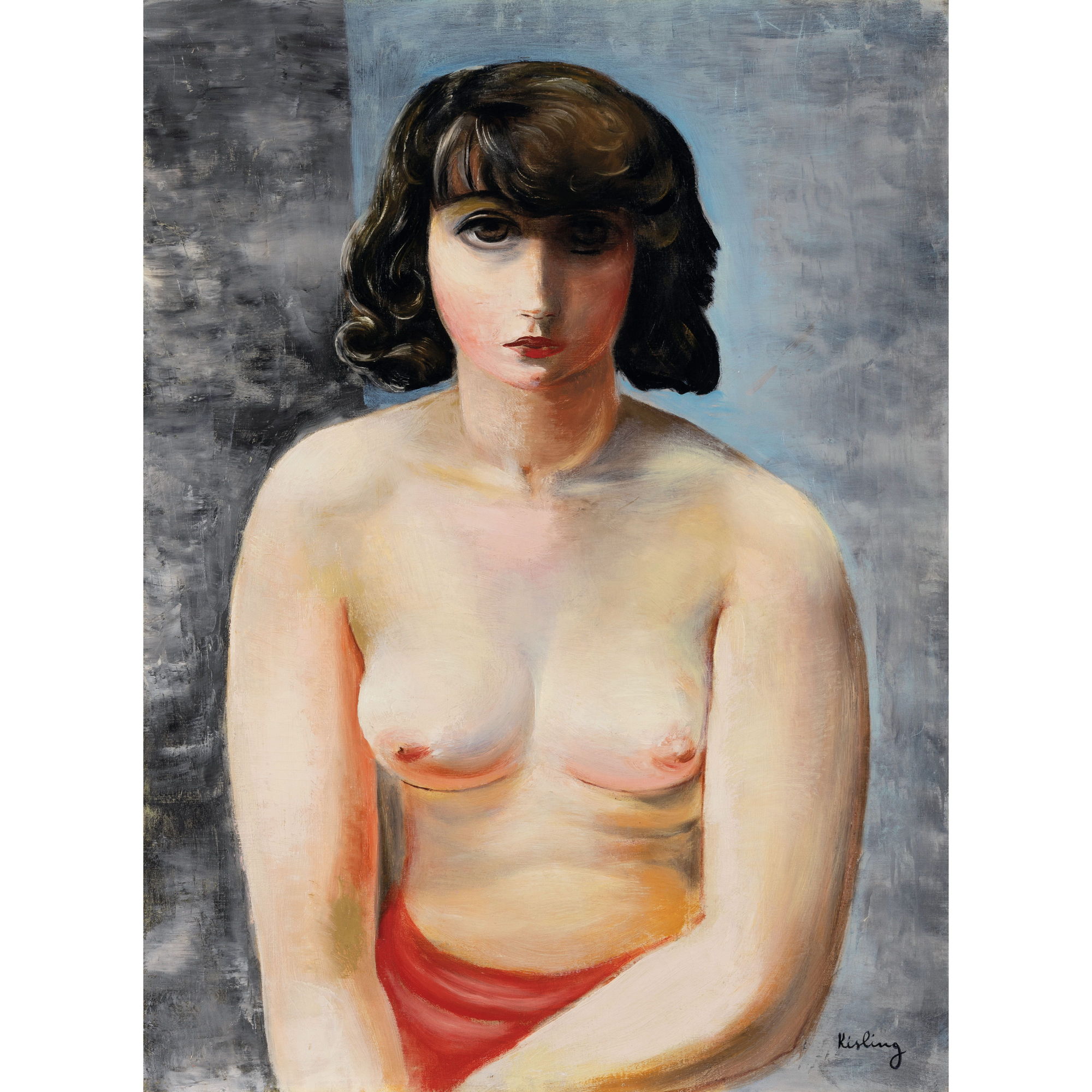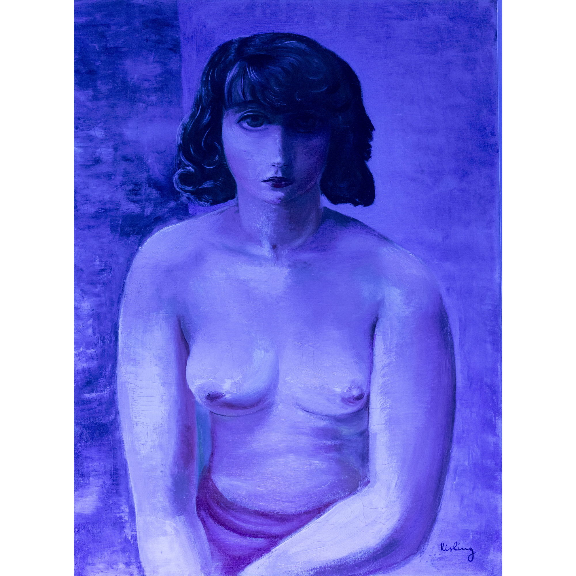 キスリングは、パブロ・ピカソやジョルジュ・ブラックとの交流を通じてキュビスムの影響を受け、対象を円錐や矩形といった図形へ還元する構築的手法を試みた。本作にもその構造意識は明確に認められる。冷ややかな青の背景、人物を安定させる壁の物質的テクスチャー、そして量感を強調する画面構成は、戦前の実験的姿勢を色濃く反映している。